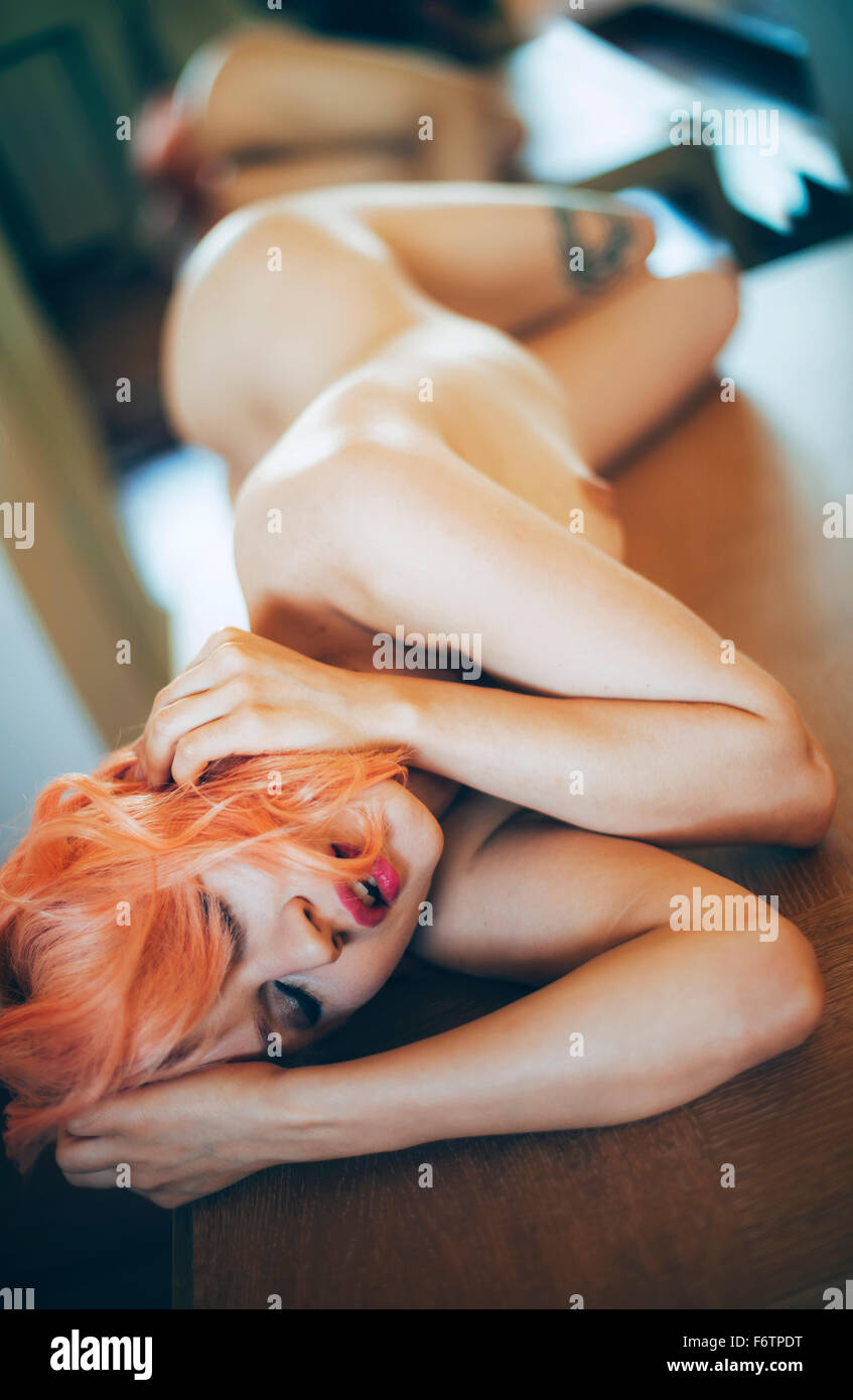 Sexy Blonde Frau Nackt Am Tisch Stockfotografie Alamy